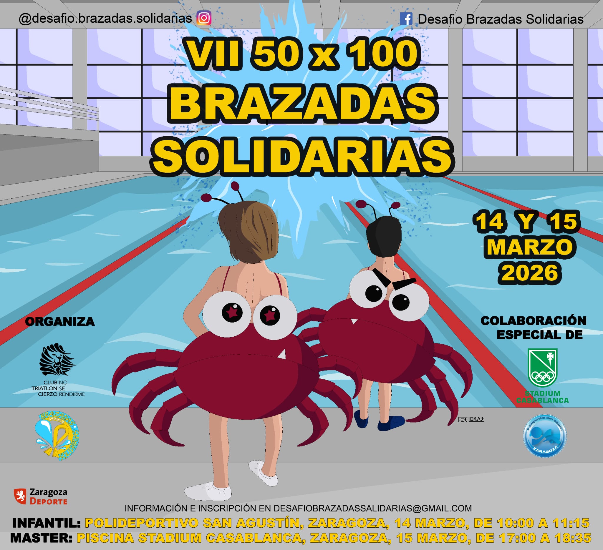 Los próximo días 14 y 15 de marzo, se celebrará la VII EDICIÓN DEL 50X100 BRAZADAS SOLIDARIAS a favor de TÁNDEM SOLIDARIO - SOMOS PERA y ACCU ZARAGOZA, organizado por Club Triatlon Cierzo y Óscar Villanueva.